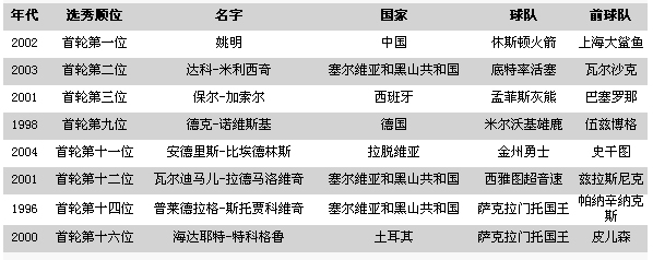 · 2005年的国际球员中顺位最高的什来自澳大利亚的安德鲁-博古特,曾在犹他大学读书的他被米尔沃基雄鹿队在第一位选中.2004年国际球员最高顺位什苏丹的罗尔-邓,在杜克大学打了几年NCAA后被菲尼克斯太阳以第七位选中.2003年的最好顺位国际球员什来自赛黑的达科-米利西奇,被底特率活塞在第一轮的第二位选走.
