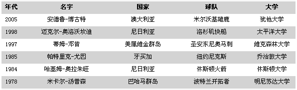自1966年以来,已经有六位参加了NCAA的国际球员成为选秀大会的状元: