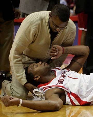 | 12月2日,休斯敦火箭队球员麦克格雷迪(下)在比赛中受伤。当日,在NBA常规赛中,火箭队主场以81比63战胜克利夫兰骑士队。 新华社发 |