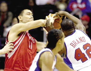 | 姚明咬紧牙关牢牢护住球,让无从下手的布兰德干着急。新华社记者 戚恒/摄 |
