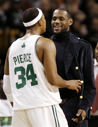 因伤缺战的詹姆斯赛前与皮尔斯寒暄