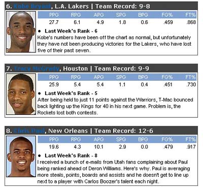 17、姚明(火箭):22.1分、10.1个篮板和2.3次助攻,上期排名:14