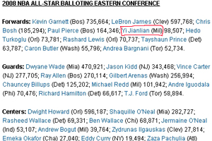 NBA今天公布了07-08全明星票选第一阶段情况,没有出现在全明星候选人名单上的中国前锋易建联居然得到98,507票,在东部前锋位置上位列第五,着实让人惊讶。美记者说不是,是整个东部前锋排名,然后帮他把前四名前锋名字一一念了一遍,“加内特,詹姆斯,波什和皮尔斯,你是第五。>>>>>[详细]
