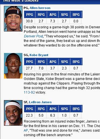 腾讯体育讯 北京时间12月19日,NBA官方公布了最新一期的周最佳阵容,科比凭借出色的表现夺回得分后卫位置,而小皇帝一复出就占据小前锋位置。霍华德依旧保持强势,压制姚明连任最佳中锋。以下为阵容具体情况及点评(括号内为所属球队):