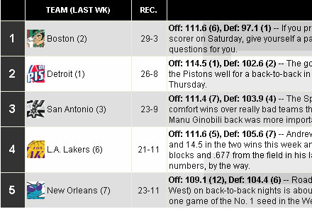 腾讯体育讯 北京时间1月8日凌晨,NBA官方公布了最新一期的球队实力榜,湖人与黄蜂的良好势头使得他们成功的挤掉风头正劲的开拓者,入主前五名。中国球迷关心的两只球队继续重复上周的态势,而这次下滑的是火箭,雄鹿则是“原地踏步”。