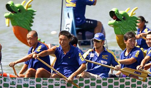 新华网消息:8月8日,刚刚在F1匈牙利站获得个人职业生涯首个分站赛冠军的F1本田车队车手巴顿(戴帽者)在上海淀山湖学划龙舟。巴顿即将出战于9月29日至10月1日在上海举行的F1中国大奖赛。 新华社记者凡军摄
