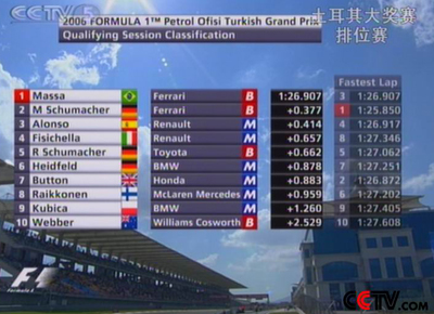 北京时间8月26日19点,F1土耳其站排位赛在伊斯坦布尔赛道进行。法拉利车队的巴西车手马萨取得自己F1生涯以来的首个杆位,他的成绩是1分26秒907。法拉利车王舒马赫和雷诺西班牙车手阿隆索分居二、三位。
