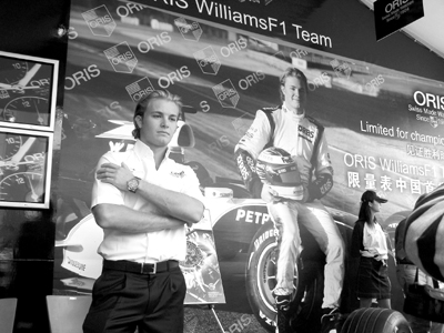 昨天,参加F1上海站的威廉姆斯车手罗斯博格出席了瑞士手表赞助商豪利时举办的商业活动。在仪式上,该赞助商发布了一款限量版手表。