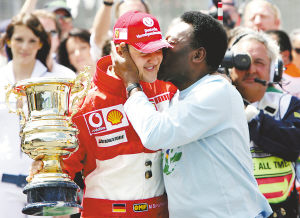 | 10月23日,F1巴西站结束后,正式退役的车王舒马赫接受球王贝利的祝贺。 小艾摄 |