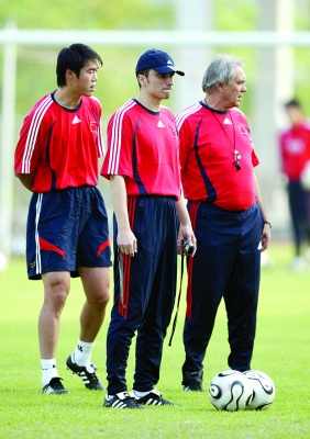 不知道是不是出于回报,朱广沪将原定于下午4点开始的国家队训练推迟了一个小时,傍晚6点,结束了国奥队训练的杜伊在奥体中心球场的另一侧出现,他小心地避开记者们的采访。细心的朱广沪马上注意到了这个客人,热情地向杜伊介绍了国家队的情况,并交流有关训练的一些话题。