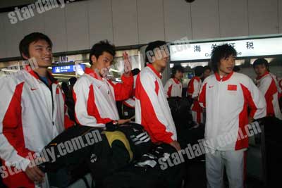 | 终于能回家了,下飞机的国奥队员们显得很开心 信报记者张成刚/摄 |