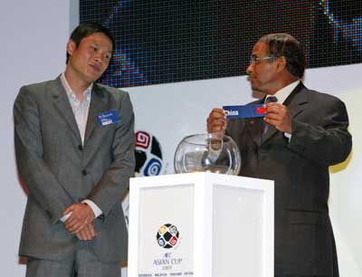 中国足协此次派出了以张吉龙为首的嘉宾团,成员中,除了必须到场的国足主帅朱广沪之外,曾经的亚洲足球先生范志毅则用自己的手来决定中国队所在的第三档次球队如何分组。作为2007年亚洲杯的四个联合主办国,泰国、越南、马来西亚和印尼被分别以第四档球队率先列入A、B、C、D组。实际上,抽出这四支东道主球队,也就意味着亚洲杯决赛阶段各小组的小组赛举办地点:A组在泰国,B组在越南,C组在马来西亚,D组在印尼。