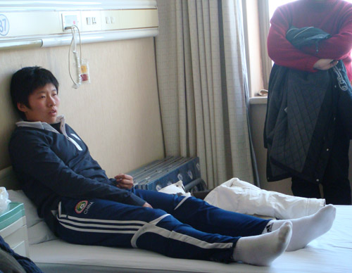 今天12点左右坐在轮椅上的马晓旭出现在首都机场,随后在队医孟兆金和队伍黄中华的陪伴下赶往北医三院。下午北医三院的余家阔博士对马晓旭的病情进行了详细的检查。余博士在看过广州黄浦医院的X光片后,认为马晓旭的右膝十字韧带断裂,外侧韧带受伤,下周一将会对其进行手术治疗。而医生一再叮嘱从21号开始,马晓旭将禁食辛辣食品。对于即将开始的手术虽然感到恐惧,但是因为主治医生曾经主刀为自己俱乐部和国家队的队友韩文霞做过类似的手术,所以也就有了底。