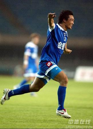 搜狐体育消息:2006年7月7日,沈阳金德队在主场沈阳五里河体育场和青岛中能交火,这是中超第一阶段第13轮的补赛,也是第二阶段的垫场赛。本场比赛原定于5月13日举行,但由于4月下旬国奥队征调金德队员出征土伦杯而改期。经过90分钟激战,沈阳金德以2比2平青岛中能。图为沈阳金德队许博庆祝进球。 (中体在线图片 王江 摄)
