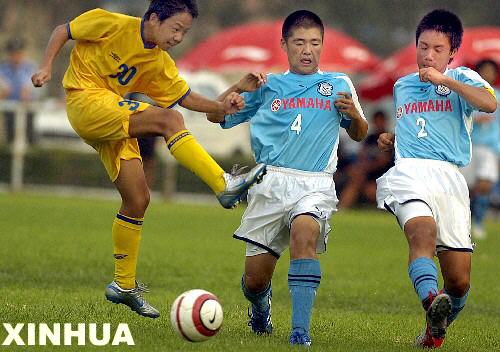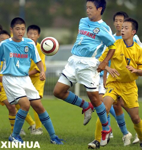 8月5日,日本雅马哈喜悦队球员今井孝(中)在U13组比赛中与中国成都队球员拼抢。最终,中国成都队以3比1获胜。当日,为期5天的2006雅马哈国际青少年足球邀请赛在山东潍坊开幕。雅马哈喜悦队、拜仁慕尼黑队和北京国安队等13支球队将参加U15和U13两个组别的角逐。新华社记者 陈晓伟摄