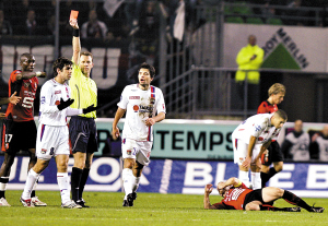 里昂队队长小儒尼尼奥在比赛中领到红牌。