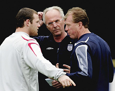 CCTV.com消息:2006年德国世界杯上,麦克拉伦是英格兰队教练,不过那个时候,老大的位置是埃里克松的,麦帅只是个副手。图为鲁尼正在与两人在巴登-巴登的训练基地进行交流。