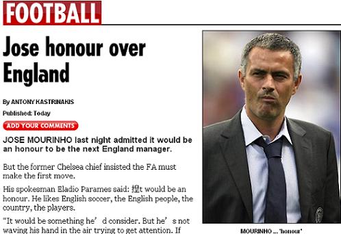 《太阳报》截图:穆里尼奥承认有意执教英格兰队