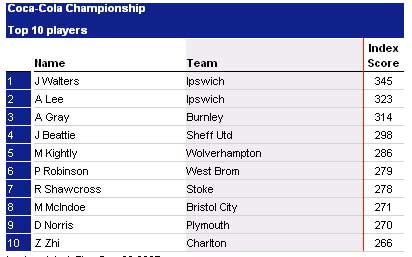 新浪体育讯 在当地时间本周四,联合通讯社公布了最新的英冠联赛官方球员积分排行榜,中国球员郑智的积分是266分,排名从英冠第5下降到了第10。不过他依然是查尔顿队的球员中积分最高的。