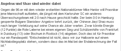 德国T-online网站也在赛后称赞科特布斯赢得了今年最重要的一场比赛,普拉什尼卡开始逐渐显现他的能力,赛后就连汉诺威主帅黑金也是输的心服口服,对普拉什尼卡和他的球队大加褒奖。另外,T-online网站同样也关注了邵佳一的表现,他们认为在漫长的休养后,邵佳一需要得到更多的比赛机会来找回球感和状态,现在他正做得越来越好。这一切对他而言都是一个好的开始。