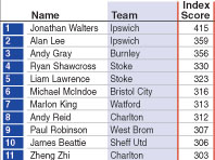 由于上一场比赛查尔顿2-4负于西布罗姆维奇,因此查尔顿球员的得分都未能上涨太多,这也是他们排名下跌的原因。郑智的得分较上期只上升了3分,而里德更是下跌了2分,里德也是查尔顿唯一一位进入前10的球员。