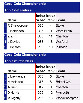 此外英国统计公司还根据球员的表现,排出了门将,后卫,中场和前锋四个位置的前五名。在后卫排行榜上郑智跌回到第三的位置,在中场球员排名上里德同样位居第三。