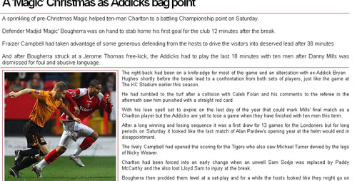 赛后,查尔顿官网以《圣诞魔术让查尔顿得到一分》为题报道了本场比赛。圣诞节前的主场比赛里,查尔顿依靠圣诞魔术帮助球队在10人应战的情况下得到了1个联赛积分。中后卫博格内拉一手缔造了这个魔术,他用自己在俱乐部的处子球,帮助球队避免了又一个主场失利。