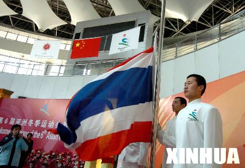1月24日,参加第六届亚冬会的泰国代表团举行升旗仪式。这是本届亚冬会首个举行升旗仪式的代表团。 新华社记者徐家军摄