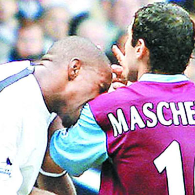 在这场英超第8轮的比赛中,热刺凭借米多的进球1比0取胜,比赛中,马斯切拉诺和迪福发生了冲突,两人一度闹得很不愉快。当时,马斯切拉诺在一次回追中,从背后铲倒了迪福,后者愤怒地爬起来,和对手对峙。尽管,热刺主帅对此事不以为然,但迪福咬马斯切拉诺的镜头却被《太阳报》的摄影记者理查德·佩勒姆拍个正着。他说:“两人都坐在草坪上,突然马斯切拉诺翻滚倒地,并痛苦地叫着。无论这是个恶意的狠咬还是个开玩笑式的轻咬,我们都不希望看到迪福有这样的表现。”主裁判本内特迅速将两人分开,两人各领到一张黄牌。