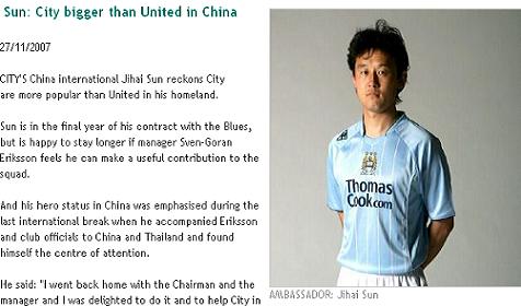 腾讯体育讯 本月的13日,曼城主席他信、主帅埃里克森携在该队效力的中国球员孙继海抵达上海,他们此行除了要和申花俱乐部签订一系列的合作协议,更重要的是扩大曼城在中国的影响力。对于那次归国“访问”,孙继海依然记忆犹新,在他看来曼城在中国的影响力已经超越了同城死敌曼联队。