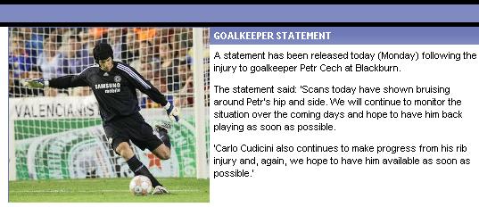 切赫是在同布莱克本的比赛中和巴拉圭前锋圣克鲁斯相撞受伤,在经过昨天的检查后伤势并没有预计的严重,但确切的复出日期仍然无法确定。切赫受伤让切尔西上下非常震动,因为蓝军的二号门将库迪奇尼因为肋骨受伤无法参加同维拉的联赛。
