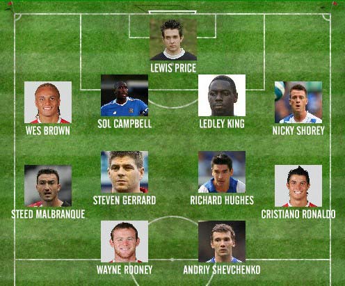 腾讯体育讯:12月26日,西方节礼日,英超第19轮比赛结束了9场比赛,四大豪门都先后出场。曼联在客场4-0完胜桑德兰,从而也在积分榜上超越阿森纳,排名第一;阿森纳则在军港被朴茨矛斯逼平,无奈让出榜首位置;利物浦客场凭借杰拉德最后时候的绝杀2-1击败德比郡,取得联赛两连胜;切尔西主场和维拉打得异常惨烈,最终双方留下的是3张红牌,8个进球,4-4平。比赛结束后腾讯体育也为大家带来了本轮最佳阵容: