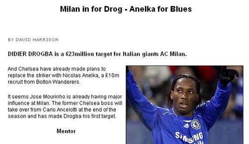 科特迪瓦前锋目前有伤在身无法比赛,他也表示很愿意跟随恩师一起前往米兰。意大利球队在冬季转会时就会对蓝军中锋发起攻势。即使在1月份切尔西不放德罗巴,米兰人也有信心把他带到圣西罗,当然前提是穆里尼奥在赛季末成为红黑军团的主教练。