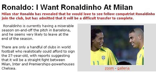 腾讯体育讯:这个冬季,关于世界足球先生罗纳尔迪尼奥的转会传言就没有停息过,欧洲各大豪门之间展开了一场看不见硝烟的暗战。在最近一段时间的转会传言中,与小罗联系最紧密的是米兰双雄,近日AC米兰前锋罗纳尔多在接受采访时就公开召唤小罗:“我想和罗纳尔迪尼奥一起并肩作战!”