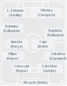 腾讯体育讯 北京时间12月10日凌晨,西甲第15轮结束所有比赛,西班牙《世界报》评选出了本轮最佳阵容(4-4-2阵型)。巴萨贡献伊涅斯塔,皇马有巴普蒂斯塔与罗比尼奥入围,锋线则由奥利维拉与法比亚诺这对中生代巴西国脚领班。值得注意的是,11人中南美外援占了8席(3个阿根廷人5个巴西人)。
