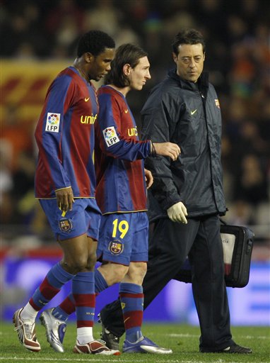 不幸的是,就在喀麦隆人带着两个进球满载而归的同时,梅西却没有得到命运给他出色表现的应有回报。第42分钟,阿根廷人在没有和对手发生明显碰撞情况下突然倒地,并很快被替换下场。尽管后来他拒绝了担架,主动走下赛场,在下半场更是出现在替补席上,但医疗检查结果却显示,梅西左腿二头肌撕裂4厘米。由于从类似伤病恢复案例来看,每厘米撕裂的伤口需要一周时间来愈合,因此阿根廷人将肯定缺席包括下轮同皇家马德里世纪大战在内的一个月比赛。