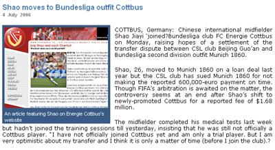 网易体育讯 中国国脚邵佳一已经通过了科特布斯俱乐部的身体检查,并随队前往了训练基地。虽然转会一事还没有最终敲定,但北京国安和科特布斯已达成了口头协议,邵佳一重返德甲只是一个时间和手续的问题。对于此事,亚足联官方网站今天也作出了报道,全文大意如下: