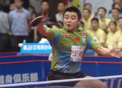 2006年7月9日,中国选手王皓在哈尔滨举行的世界乒乓球男子争霸赛决赛中,中国选手王皓在哈尔滨举行的世界乒乓球男子争霸赛决赛中,以4比1战胜德国选手波尔,夺得冠军。新华社记者李勇摄
