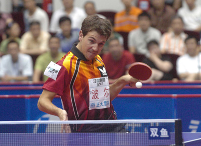 2006年7月9日,中国选手王皓在哈尔滨举行的世界乒乓球男子争霸赛决赛中,德国选手波尔在哈尔滨举行的世界乒乓球男子争霸赛决赛中,以1比4负于中国选手王皓,获得亚军。 新华社记者李勇摄