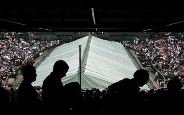 搜狐体育消息:北京时间7月5日,温网公开赛开始进行第九日的角逐,图为男单四分之一决赛费德勒对阵安西奇的比赛中,突然天降大雨比赛中断,现场观众离场。