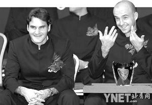 ■与沉稳的费德勒相比,柳比西奇(右)绝对是个活宝 网球明星身着统一黑色中山装 近距离接受球迷追捧———