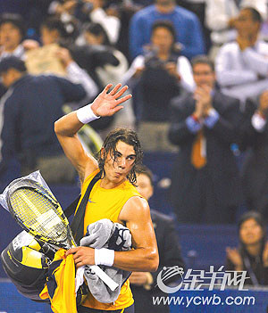 羊城晚报消息(记者祁冬):2006上海大师杯比赛昨天继续在旗忠网球中心进行。球迷们一早就在赛场里挂起了七八面西班牙国旗,可是西班牙双雄纳达尔和罗布雷多却在金组的单打比赛中双双告负。不过,他们带来的两场精彩激战还是让球迷拍红了手掌。