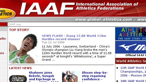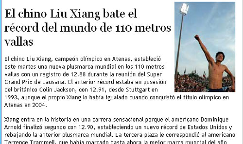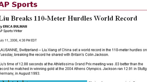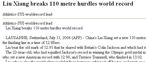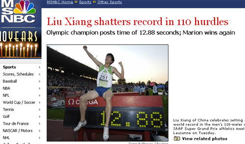 新华网消息:北京时间7月12日凌晨,中国选手刘翔在瑞士洛桑田径超级大奖赛上以12秒88的成绩打破了由他本人和英国选手科林-杰克逊共同保持的12秒91的110米栏世界纪录,赛后有关刘翔破纪录的报道占据了世界各大体育网站和体育媒体网络版的头条显要位置,以下是部分权威媒体对此事的报道: