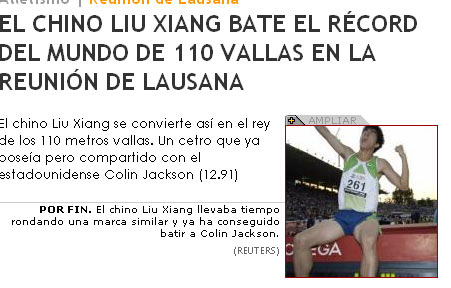 西班牙《阿斯》报:刘翔打破110米栏世界纪录,成为了田坛跨栏“第一人”。