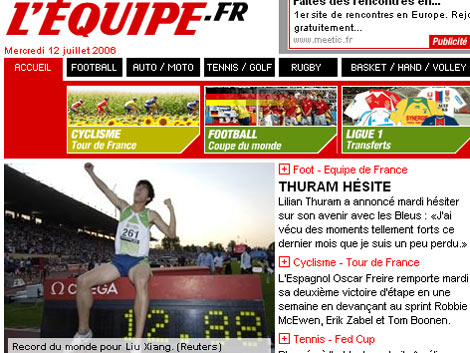 法国最具权威的体育媒体《队报》称,刘翔在洛桑跑出12秒88的成绩,打破了12秒91的世界纪录。另外在刘翔破纪录后很快队报就更换了头条,原来法国队和齐达内的新闻退居次席。