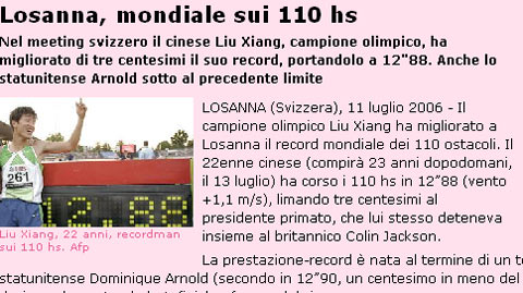 意大利的米兰体育报标题是:洛桑,110米栏世界纪录。文中称在瑞士洛桑,奥运冠军,中国选手刘翔刷新了110米栏的世界纪录。年仅22岁的刘翔(在后天,7月13日将迎来他23岁的生日)在110米栏的比赛中以12秒88的成绩(风速+1.1米/秒)以三个百分点的优势刷新了由英国人科林-杰克森保持的前世界纪录。刘翔的新世界纪录是在同美国选手多梅尼科-阿诺德的竞争中产生的。获得第二名的阿诺德的成绩是12秒90,比前世界纪录早了一个百分点,将第一名的位置拱手让于来自中国的选手刘翔。