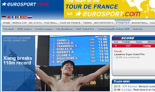 eurosport(欧洲体育)称,刘翔打破110米栏世界纪录。两次世锦赛冠军得主科林-杰克逊1993年在德国斯图加特创造了12秒91的世界纪录,这纪录12年零10个月之后终于被打破,刘翔成为了跨栏第一人。
