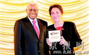 图2:2006年8月14日,国际田联在北京之夜剧场举行了欢迎酒会。田联主席拉米恩-迪亚克为郑凤荣颁发女子跳高世界纪录纪念奖章。