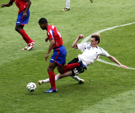 新华社消息:慕尼黑,2006年6月9日 [足球世界杯](2)揭幕战:德国首战哥斯达黎加 6月9日,德国国家队球员蒂·博洛夫斯基(右)在比赛中铲断。当日,第十八届世界杯足球赛在德国慕尼黑世界杯体育场拉开战幕,东道主德国队和哥斯达黎加队在揭幕战中相遇,目前比赛仍在进行中,德国队以2比1暂时领先。 新华社记者李岳摄