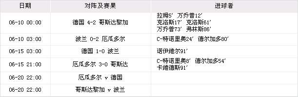 在小组赛中哥斯达黎加在6月10日对阵德国获得了两枚进球,以2:4的比分败于东道主,而在6月15日与厄瓜多尔的比赛却未能打入1枚进球,以3:0惨败,这让本来就在第一场负于德国的哥斯达黎彻底绝望,与波兰一道结束在德国世界杯的行程。想晋级16强的愿望彻底的破灭。6月20日22:00将要对战波兰,都是为了尊严而战的两支队伍将要展开一场难以想象的厮杀。